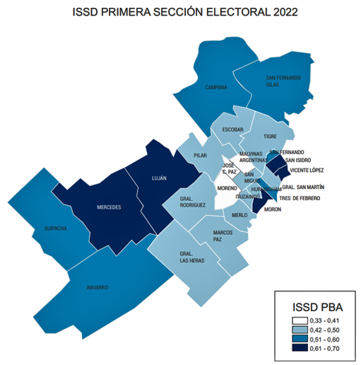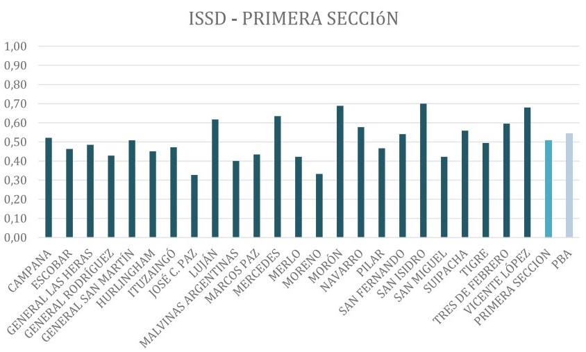 Al centrar el análisis en la comparativa entre los distritos vecinos, se destaca el diferencial existente en Vicente López (0,44) y San Isidro (0,65) en relación a un territorio con menor ISSD como es el caso de San Fernando, que comporta al interior de esta variable un registro marcadamente superior (0,78) a los dos últimos mencionados.