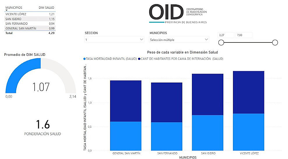 Esta dimensión dentro del ISSD está compuesta por dos variables. En primer lugar, la tasa de mortalidad infantil, la cual mide la cantidad de niños fallecidos menores de un año de edad por cada 1.000 nacidos vivos en un periodo de tiempo determinado, variable que se presenta como una síntesis de problemas sanitarios estructurales y coyunturales. Por otro lado, contamos con la cantidad de habitantes por cama de internación, variable generada en el marco de la pandemia de Covid 19, dato que nos permite evaluar de manera sintética la preparación de los territorios en caso de emergencias sanitarias. Atendiendo esto último, San Isidro (0,72) se encuentra por encima del promedio de la sección electoral primera (0,54) y de la media provincial (0,65) respectivamente.