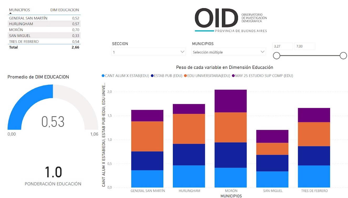 Esta dimensión está compuesta por cuatro variables. En primer lugar, la cantidad de población en edad potencialmente escolar de todo el distrito sobre la cantidad de establecimientos educativos (públicos) en pos de observar el tamaño de la capacidad instalada; en segundo lugar, la matrícula real de estos establecimientos para observar el grado de ocupación efectiva de los mismos. Seguidamente, la accesibilidad al sistema universitario la observamos a partir de la presencia o no de establecimientos universitarios (públicos y privados, por su carácter no obligatorio y formativo). Por último, se cuantifica el volumen de población de 25 años y más con estudios superiores para medir su efecto concreto.