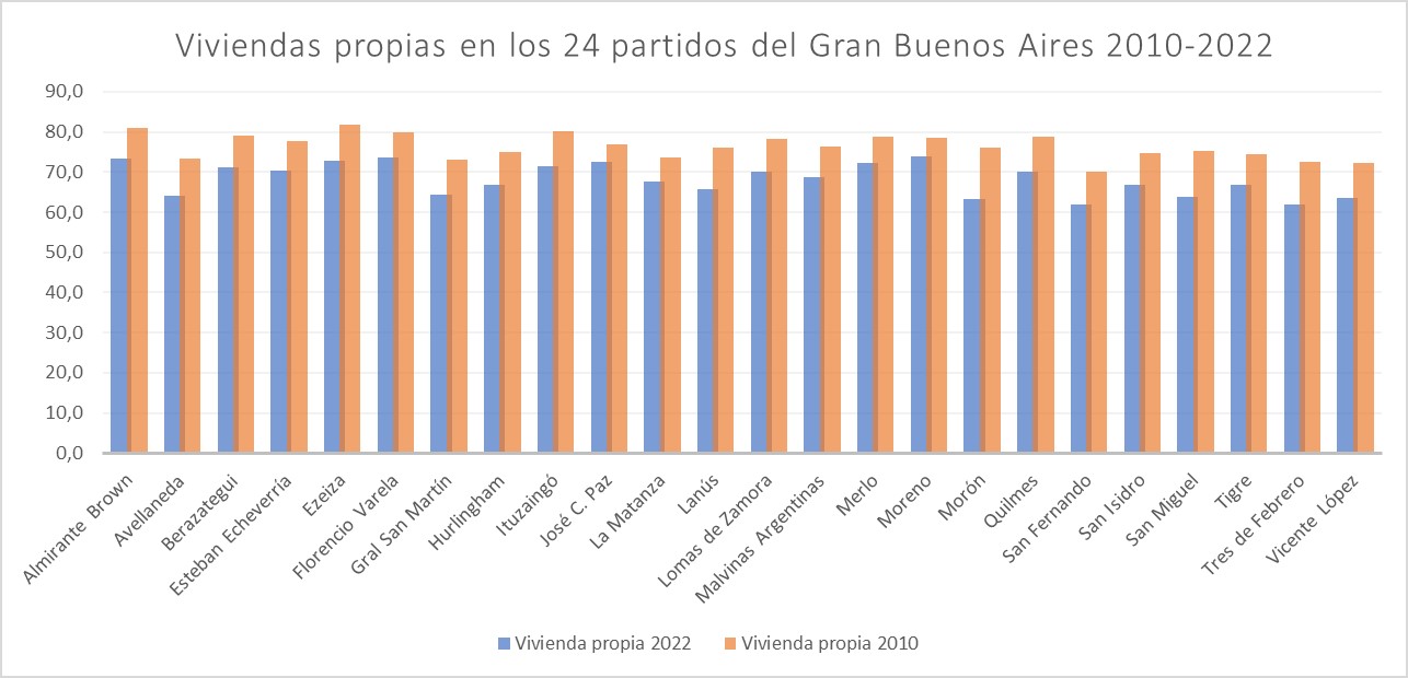 Como puede observarse en el gráfico, donde más visible se hace la caída de propietarios entre 2010 y 2022 es en Tres de Febrero (también en San Miguel, Morón, Lanús e Ituzaingó) pasando de 73% a 61,8%. No solo es de los distritos que más decreció, sino también es el de menor porcentaje de hogares propietarios dentro de los 24 distritos del GBA.