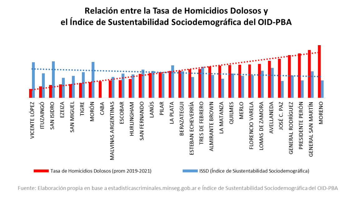 ¿Por qué San Martín y Avellaneda presentan una Tasa de Homicidios Dolosos tan alta a pesar de mostrar también valores altos en el ISSD…? ¿Qué política pública distingue a Malvinas Argentinas de José C Paz para mostrar tanta diferencia en la Tasa de Homicidios Dolosos estando un Municipio al lado del otro y presentando un ISSD semejante…? ¿Cómo es la evolución en el tiempo de la Tasa de Homicidios Dolosos en territorios muy afectados por la violencia y la inseguridad como por ejemplo Moreno…? ¿Por qué Ezeiza muestra una Tasa de Homicidios Dolosos tan baja teniendo un ISSD semejante a, por ejemplo, General Rodríguez que está en el otro extremo de la tabla…?